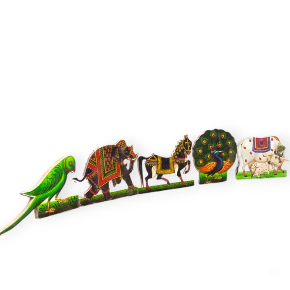 | Elevate your home temple décor with this exquisite Shri DP Animal Toy Set from Nathdwara for Laddu Gopal ji, Thakkur ji, Shrinath ji Pusti Seva, and other deities – Ganesh ji / Mata ji etc. Crafted from premium MDF material, this set features intricately cut-out designs of elephants, horses, parrots, Cow, Peacock and floral patterns, capturing the essence of traditional Indian art. Arrange these vibrant pieces around your deity to create a captivating display that honours your spiritual beliefs. With its vibrant colours and intricate detailing, this set adds a touch of cultural richness and devotion to your puja space. Enhance your daily rituals with this stunning temple decoration set. |