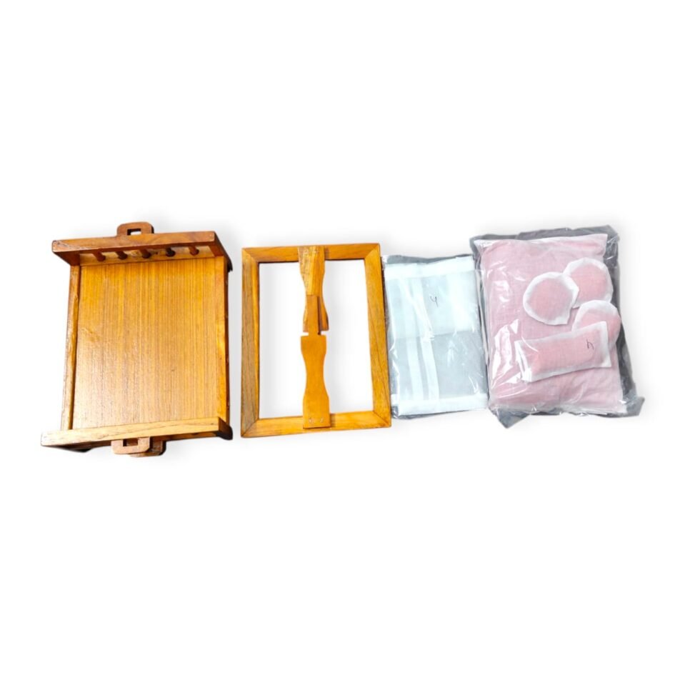The set includes a finely polished wooden bed adorned with traditional Rajasthani craftsmanship. It comes complete with a soft Gaadi (mattress), pair of Takiya (pillows), and a delicate Net canopy—perfect for Shayan Seva, offering comfort and charm to Thakurji’s resting hours.